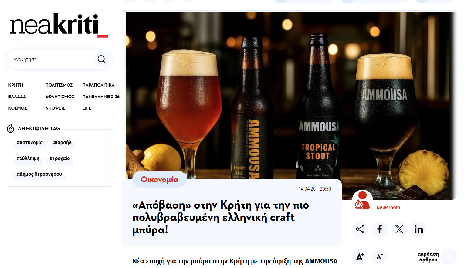 Μια μοναδική διάκριση για την ελληνική μικροζυθοποιία και την πόλη της Πάτρας σημειώθηκε στο πλαίσιο της 12ης ΕΞΠΟΤΡΟΦ - The B2B Fine Food Exhibition. Η πατρινή δημιουργία AMMOUSA μπύρα κατέκτησε την απόλυτη κορυφή στα βραβεία γεύσης και ποιότητας Athens Fine Food Awards (AFFA) 2026, με την Tropical Stout να αναδεικνύεται ως το κορυφαίο προϊόν της...